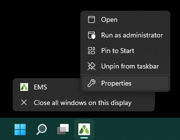 1.First pin EMS Desktop Client when it is open by right clicking the icon in the taskbar and select Pin to taskbar. This creates a shortcut to EMS.exe.