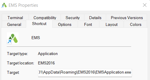 3.In Target, change ..\EMS2016\EMS\EMS.exe to ..\EMS2016\EMSApplication.exe.